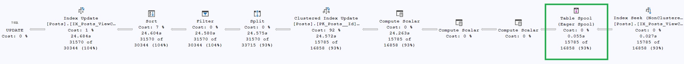 Quando Optimized Halloween Protection non è attivo, per evitare il problema di Halloween, SQL Server inserisce l’operatore Table Spool (Eager Spool) nel piano di esecuzione per prevenire aggiornamenti multipli sulla stessa riga. Questo operatore materializza le righe qualificate in una struttura temporanea prima che inizi l’aggiornamento. In questo modo, anche se la posizione di una riga nell’indice dovesse cambiare, essa non verrebbe rielaborata.